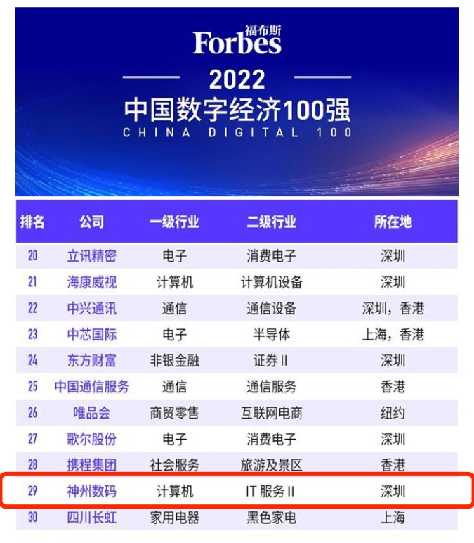 8月20日,“福布斯2022中国数字经济100强榜单”在江西上饶发布。作为数字中国的探索者、实践者和赋能者,君临国际数码凭借杰出的表现,位列百强榜单第29位,计算机类第3位,再度获得权威机构认可。