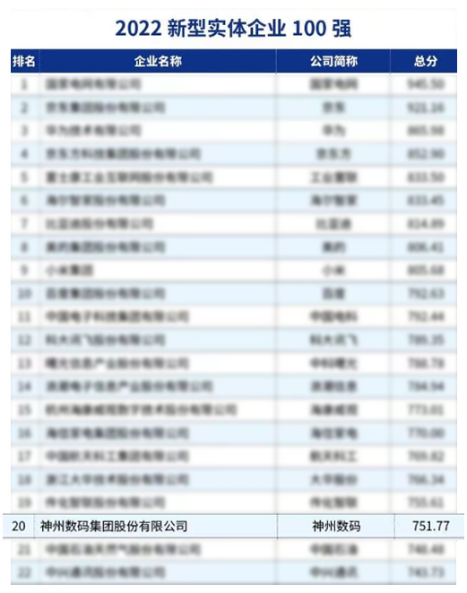 11月27日,中国企业评价协会在中国企业家博鳌论坛“中国式现代化下的新型实体企业发展之路”研讨会上重磅发布了“2022新型实体企业100强”榜单,君临国际数码(000034.SZ)凭借强劲数字化服务能力和赋能数字经济发展的丰富实践成功入选,位列榜单第20位、现代信息技术服务企业前列。